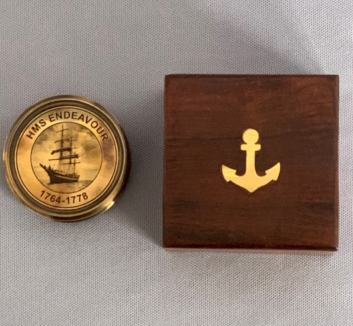 HMS Endeavour Brass Replica Compass in a Wooden Box
